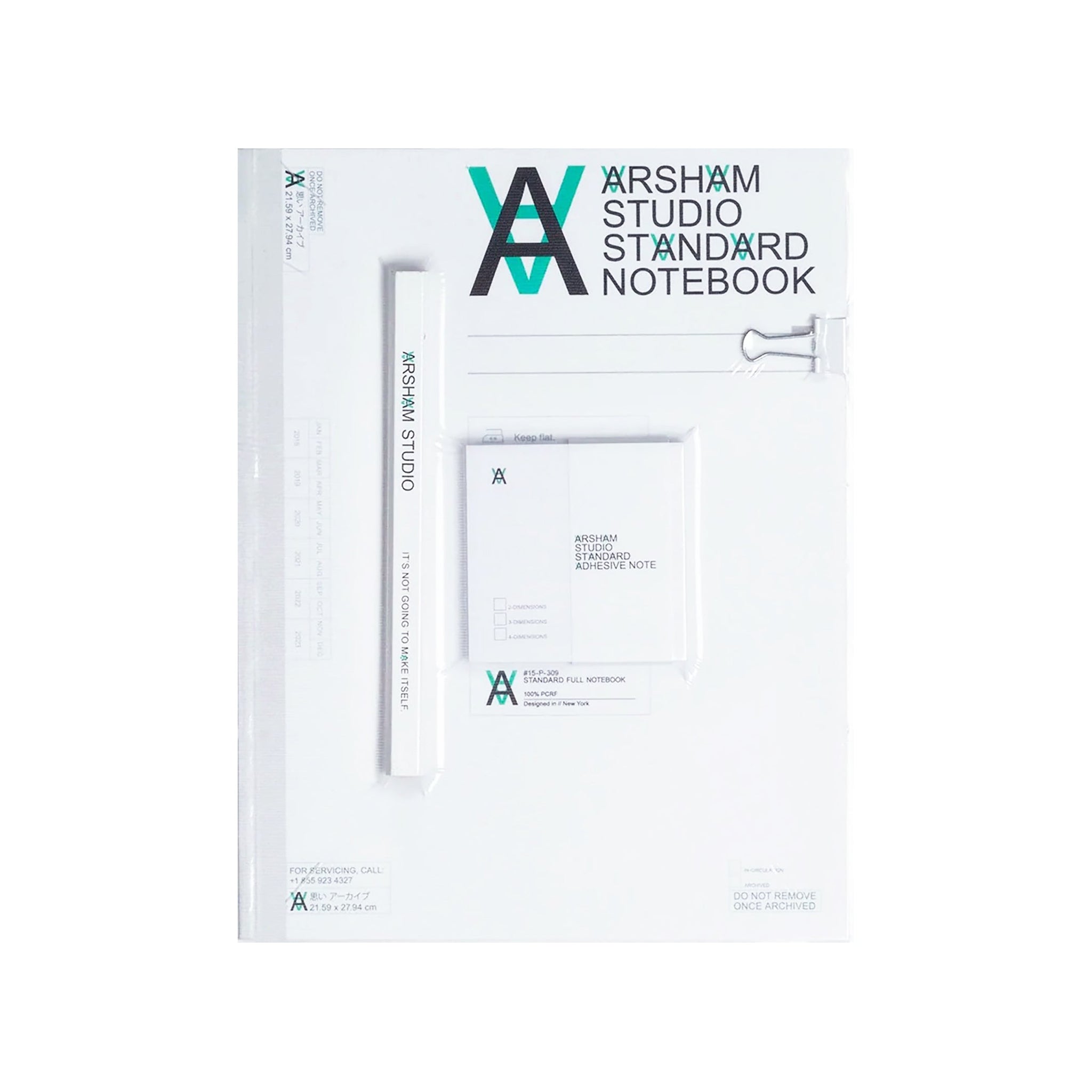 ARSHAM STUDIO FIELD OBSERVATION KIT is a Studio-issued note taking device in a limited edition of 500. The edition number will be marked with a holographic sticker that is unique to the studio. The full package includes specially-designed notebooks, a carpenter pencil, a binder clip, and an adhesive note pad. The kit is to be used for observations, tasks, and problem-solving. The notebook is 8.5 x 11” with 96 interior pages. The adhesive note pad contains 50 pages at 3 x 3”. The carpenter pencil, used to cut and measure wood and other materials, should be hand sharpened with a blade upon receipt. Collect all loose notes, images, and observations with the binder clip. The entire package comes sealed in anaerobic poly nylon.