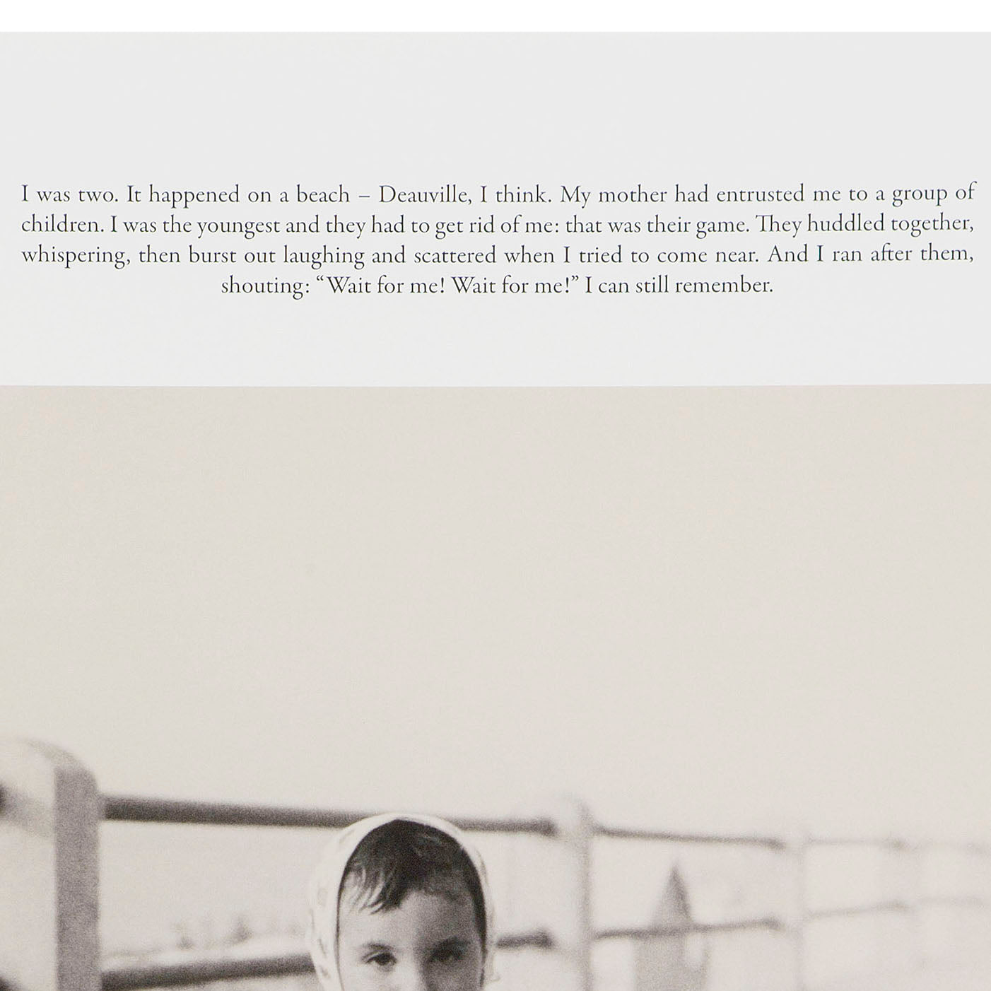 "I was two. It happened on a beach-Deauville, I think. My mother had entrusted me to a group of children. I was the youngest and they had to get rid of me: that was their game. They huddled together, whispering, then burst out laughing and scattered when I tried to come near. And I ran after them, shouting: «Wait for me! Wait for me!» I can still remember."